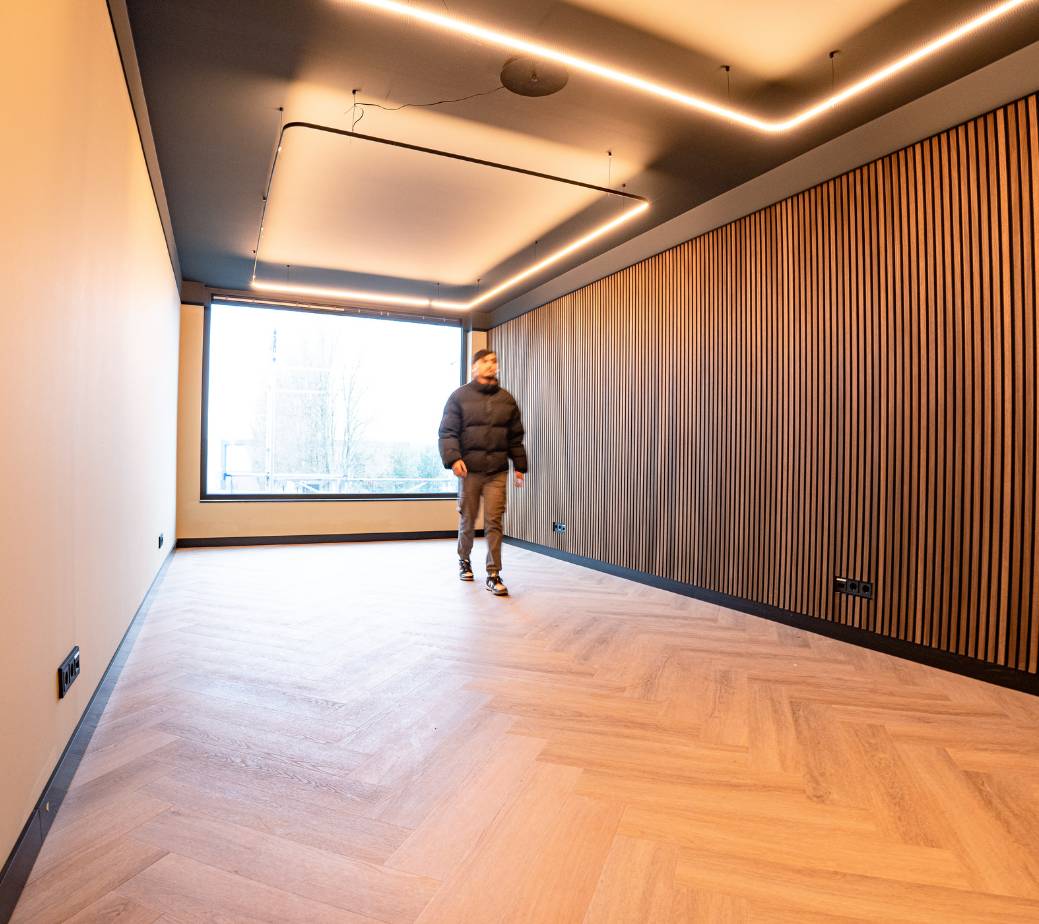 Visgraatvloer, wandpanelen & kookeiland